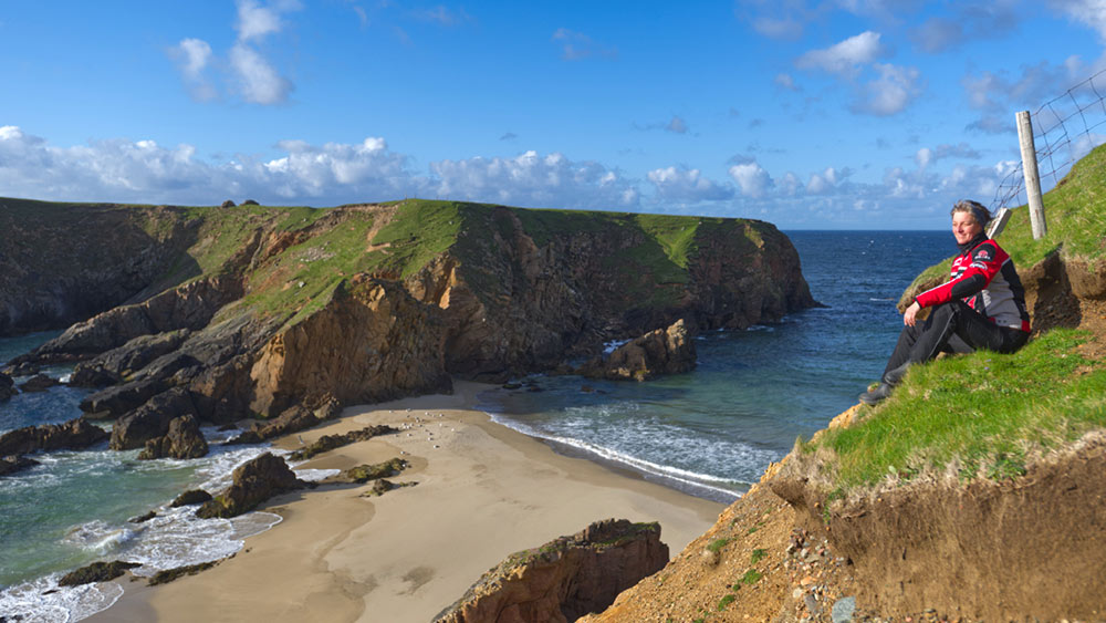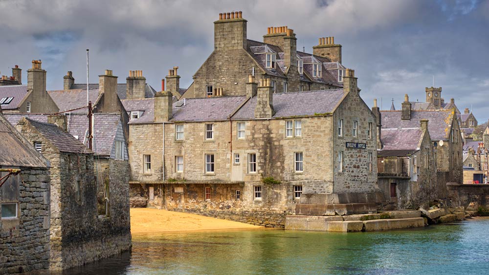 Immer wieder blinzelt die Sonne zwischen den zerrissenen Wolken durch, beleuchtet die vom Regen gewaschenen Steinhäuser entlang der Marketcross Straße. Blauweiße Shetland-Fähnchen flattern im Wind und aus den Boxen über des Souvenirshops tönt Fiddel-Musik.
