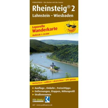 Die Wanderkarte beschreibt den zweiten Teil des Premiumwanderweges von Lahnstein bei Koblenz bis Wiesbaden im Leporello-Format. Die 172,5 km führen naturnah am rechtsrheinischen Ufer entlang; auch auf schmalen Pfaden in angrenzende Wälder und Weinberge durch die Regionen Mittelrhein und Rheingau. Welche Sehenswürdigkeiten außer der Loreley noch auf diesem Weg locken, erfährt man in den bebilderten Infoblöcken, die zwischen den Kartenabschnitte eingefügt sind.